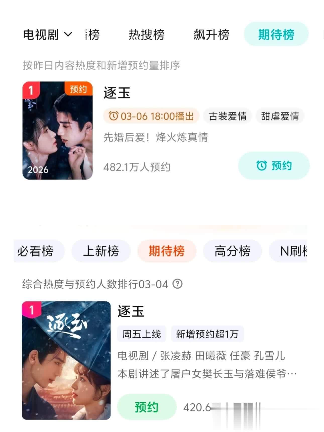 别不信它的热度,还没开播呢,腾讯+爱奇艺双平台的预约量就径直破了900万——光腾讯就有482万,爱奇艺也有420.6万,这数据真实没谁了,妥妥的未播先火!