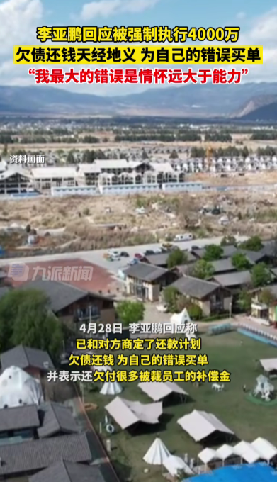 2023年4月28日,针对“李亚鹏被强制实行4000万”的音尘,李亚鹏本东说念主发文回报:已和对方约定了还款策划,强制实行是一个老例过程。