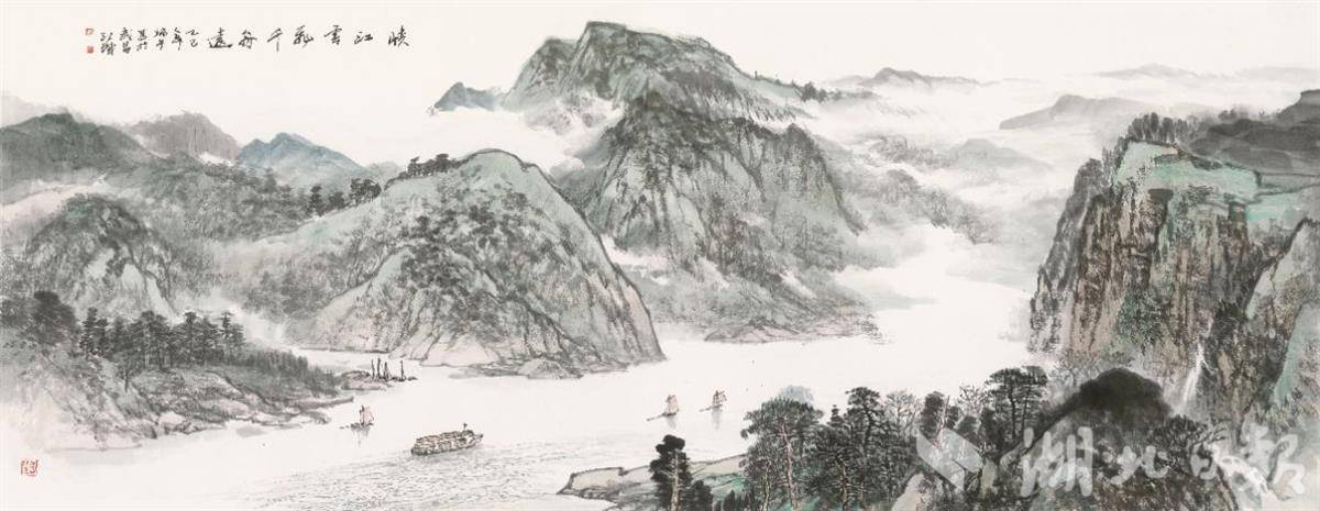 施江城《峡江云飞千舟远》367x144cm 2025年