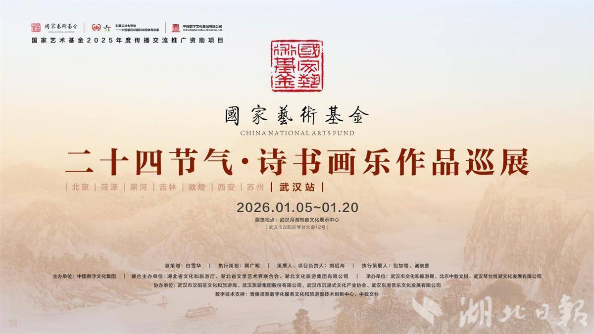 湖北日报讯(记者海冰、通信员刘沧海)1月5日,“二十四骨气·诗字画乐作品巡展(武汉站)”在武汉琴台月湖挚友文化展示中心拉开帷幕,为公众带来一场集诗、书、画、乐于一体的中华传统文化艺术盛宴。展览系文化和旅游国听说播形势、国度艺术基金2025年度传播交流推论资助形势。