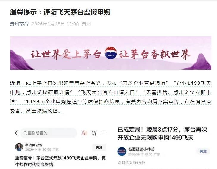 据贵州茅台官微音书,近期,线上平台再次出现冒用茅台口头,发布“通达企业直供通说念”“企业1499飞天申购,点击领路取得细则”“飞天茅台官方苦求进口”“无需搭售、点击领路立即苦求”“1499元企业申购通说念”等失实招商信息,联系实验均属空虚宣传,存在误导糜费者、以致愚弄风险。公司从未授权或寄予任何主体,发布以上信息。当今,公司各省区自营店正在与原有企业团购客户强项2026年销售公约,通过线下对接,进行天禀审核、公约签约,未通过公开领路或酬酢媒体直接收理苦求。